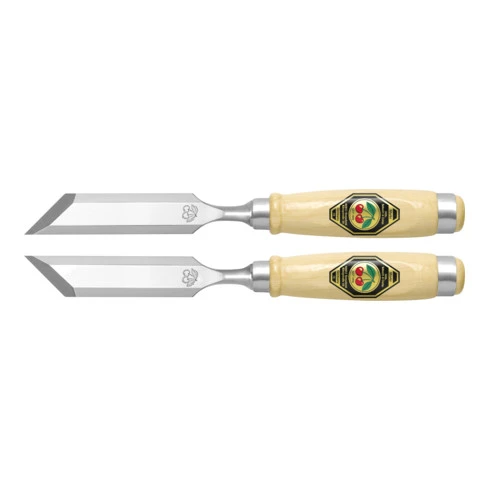 Paire de burins plus fermes à bord incliné, avec manche en charme aplati. Les ciseaux ont un bord angulaire de 45° afin que vous puissiez facilement atteindre les coins intérieurs.