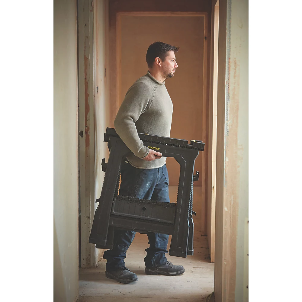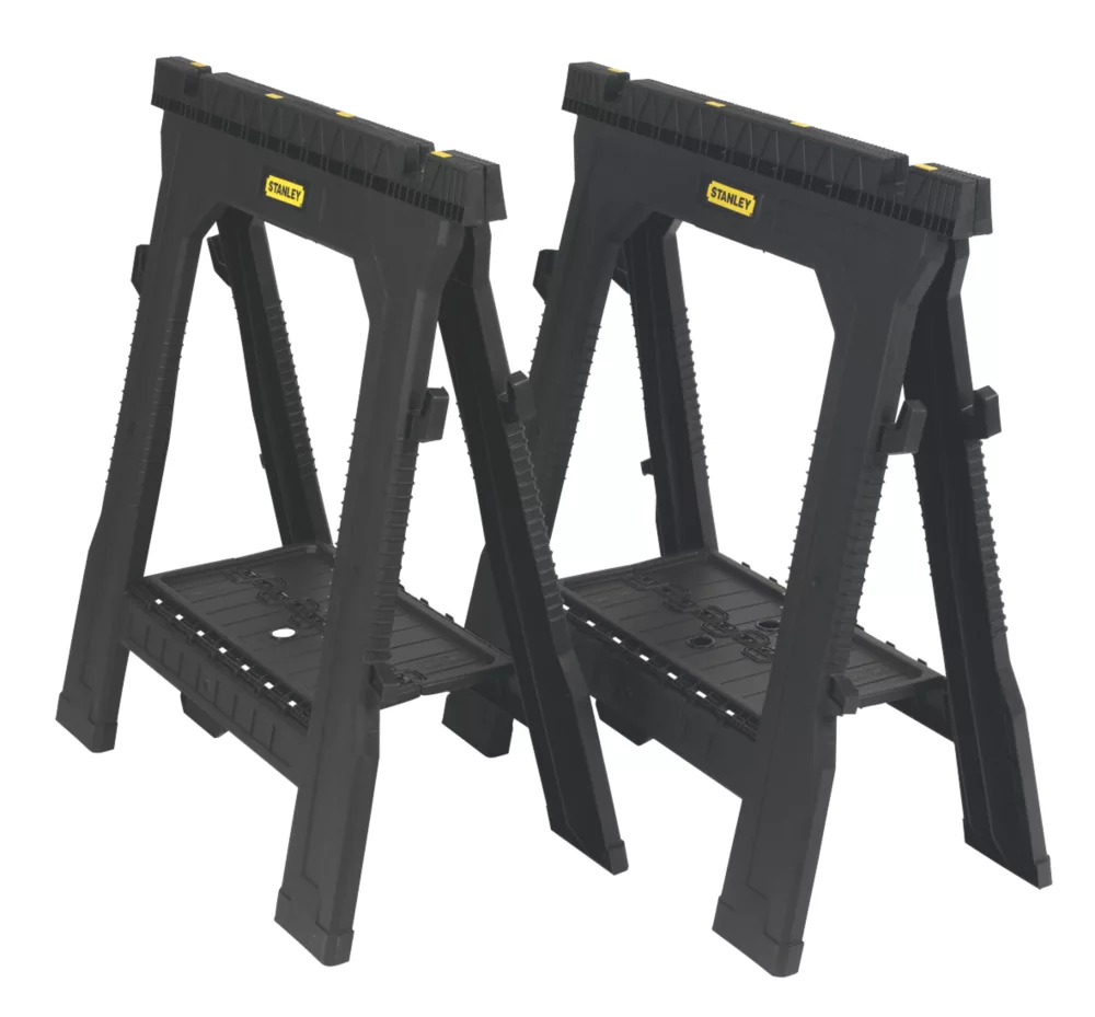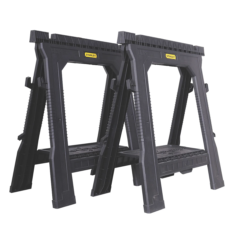 Chevalets de sciage pliables légers et robustes, avec poignées en caoutchouc, rainure en V et étagère de support.