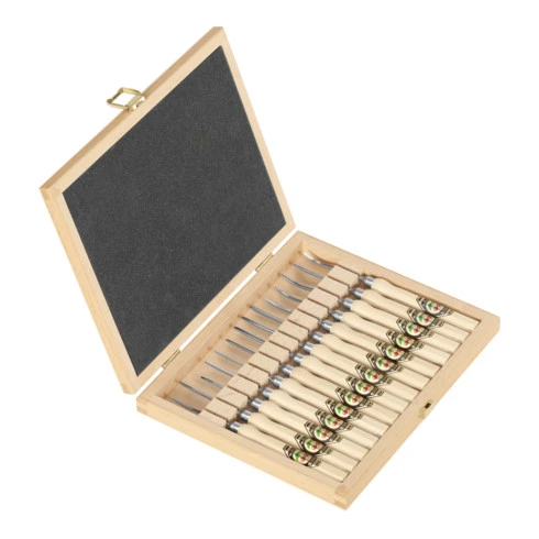 Set de 14 fers à découper décoratifs, Longueur totale env. 170 mm, avec manche octogonal en hêtre blanc, pour la réalisation des plus belles sculptures (par ex. visages sculptés, portraits, etc.).), en caisse bois 14 pièces de 1 pièce : 5300 : 1,5 mm 5301 : 1,5 mm 5302 : 1,5 mm 5303 : 1 mm 5306 : 1 mm 5311 : 0,5 mm, 1 mm, 1 mm, 1,5 mm, 2 mm 5315 : 1 mm 5320 : 0,5 mm, 1 mm 5339 : 1,5 mm 5340 : 1,5 mm